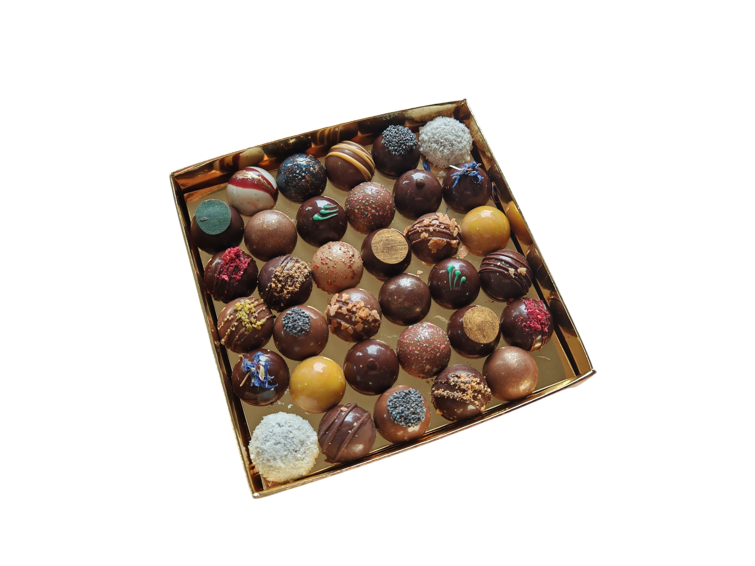 Coffret de 34 chocolats délicats, fabriqués à la main de manière entièrement artisanale.